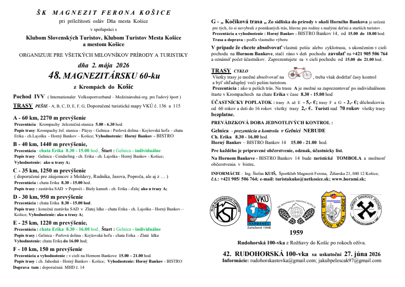 ŠK MAGNEZIT FERONA Košice v spolupráci s Klubom Slovenských Turistov, Klubom Turistov Mesta Košice a mestom Košice organizuje pri príležitosti osláv Dňa mesta Košice 48. MAGNEZITÁRSKU 60-ku.