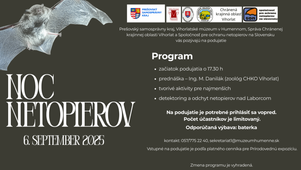 Vihorlatské múzeum v Humennom v spolupráci so Správou CHKO Vihorlat a Spoločnosťou pre ochranu netopierov na Slovensku pozýva širokú verejnosť na podujatie NOC NETOPIEROV 2025, ktoré sa uskutoční 6. septembra 2025 o 17.30 hod. v priestoroch Vihorlatského múzea v Humennom.