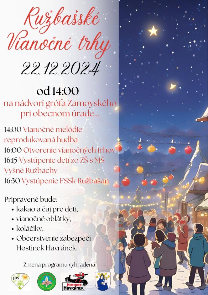 Vychutnajte si atmosféru Vianoc na nádvorí grófa Zamoyského pri obecnom úrade. V programe nechýbajú hudobné vystúpenia a otvorenie vianočných trhov.