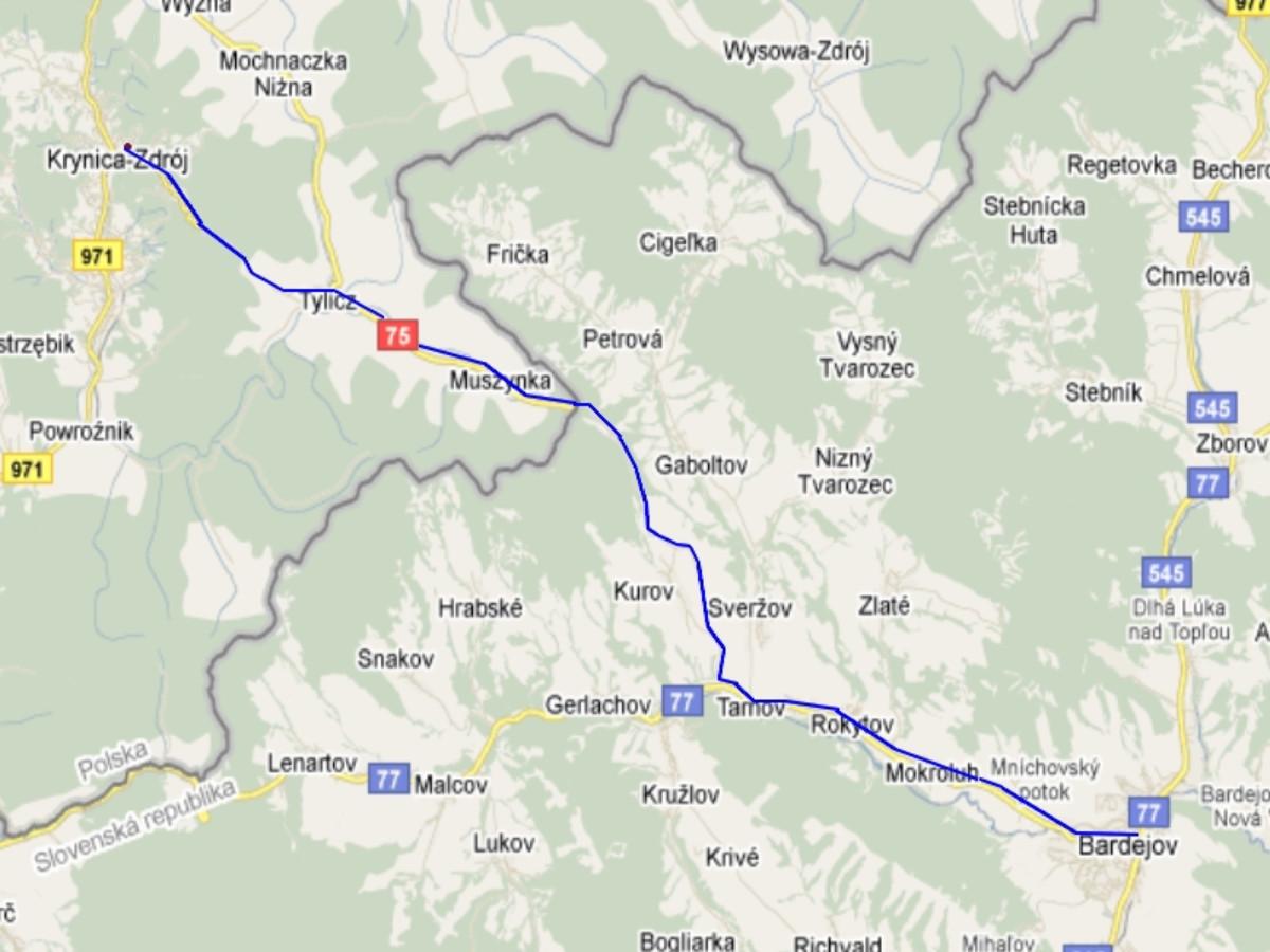 The road goes from Bardejov to Stará Ľubovňa. After the village of Tarnov you need to turn to the right, towards Kurov. After about 1.5 km you have to turn right again and head towards Poland. The route in Poland leads through the villages of Muszynka and Tylicz to the picturesque Krynica.
