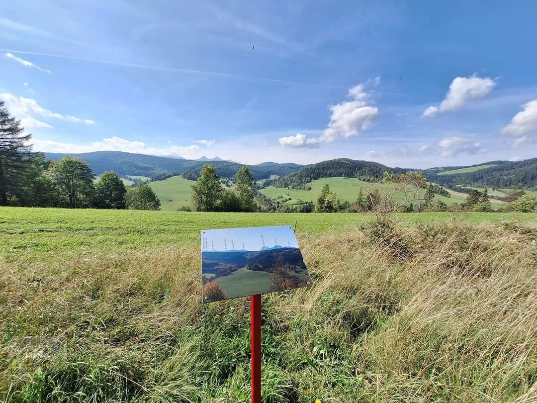 Po ceste uvidíte štíty Troch korún, najznámejších vrcholov v Pieninskom národnom parku. Odbočka zo zelenej trasy značená žltou značkou smeruje krížom cez lúku hore kopcom k vyhliadke s fotografiou a popismi tatranských štítov nad dedinu, odkiaľ uvidíte v diaľke panorámu Vysokých Tatier.