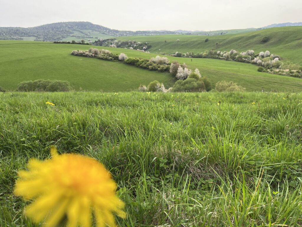 Podobná trasa vedie z konca obce Rožkovany, asfaltovú cestu vystrieda poľná cesta a následne chodníček hore kopcom.