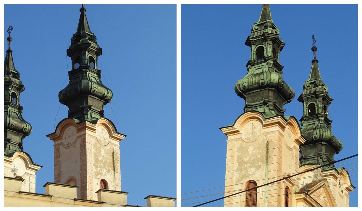 V meste sa na veži kláštora Piaristov s kostolom zachovali štyri vertikálne slnečné hodiny na každej svetovej strane. Tieto hodiny sú neúplné, bez číselníka a číslic. Sú kruhového tvaru s kovovou tyčou ukazovateľa. Umiestnenie hodín zo všetkých svetových strán kostola je výnimočné, no sú už v značne poškodenom stave.