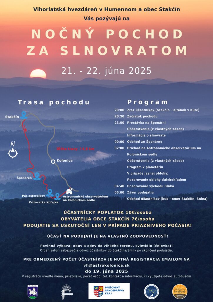 Zraz účastníkov je o 20.00 hod. v Stakčíne v altánku v Kúte. Na mieste sa tiež hradí účastnícky poplatok. Vyráža sa o cca 20.30 hod. Plánovaná je prestávka na Šponárni okolo polnoci, s občerstvením z vlastných zásob. V cieli pochodu, na Astronomickom observatóriu na Kolonickom sedle bude možnosť absolvovať prehliadku areálu a program v planetáriu. Za jasnej oblohy bude prebiehať pozorovanie planéty Saturn.