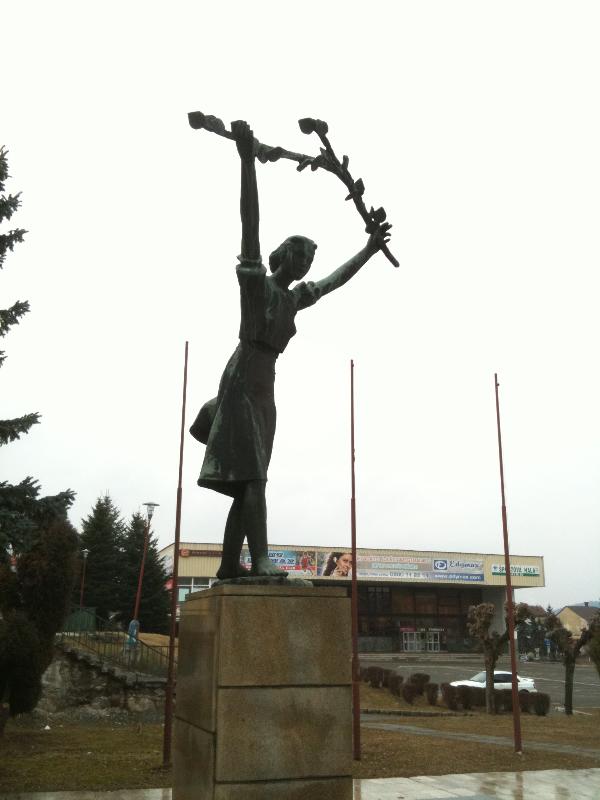 Plastika dievčaťa, ktoré lipovou ratolesťou víta vojakov Sovietskej armády, je dielom akademického sochára Františka Gibalu.