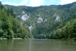 Skalné steny na Sokolici klesajú kolmými zrázmi k hladine Dunajca.